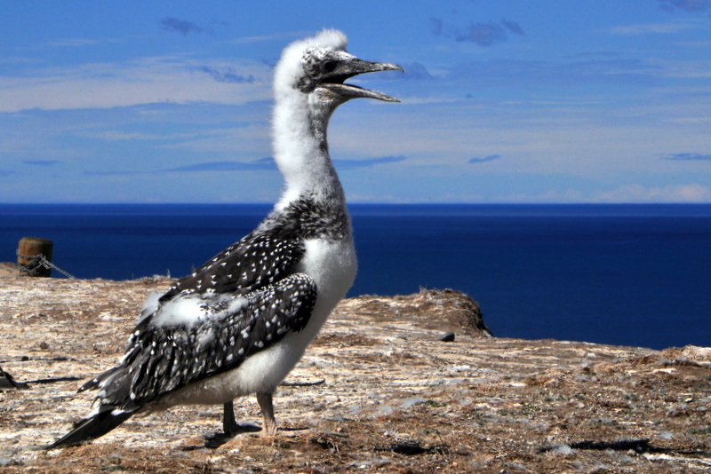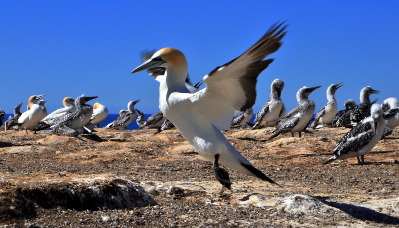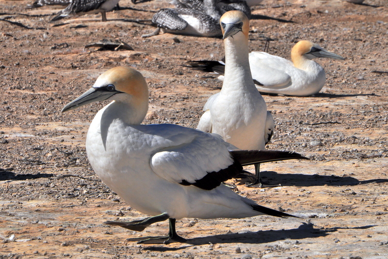 We hadden natuurlijk al de Jan van Genten kolonie bij Muriwai gezien, maar hier komen we echt heel dichtbij. We hebben geluk dat we hier in het naseizoen zijn. Het busje zit nog niet halfvol. Op hoogtij dagen deel je deze ervaring met zo’n 150 andere vogelaars. Nu zijn we hier met slechts 8 anderen en we lopen elkaar dus niet in de weg bij het fotograferen. Het enige dat ons scheidt van de vogels is een lage kabel om de vogels wat eigen ruimte te geven. Nog geen 2 meter daarachter zitten honderden vogels. Het merendeel zijn het de pluizige jongen, in vol wit dons zijn ze nog maar een week of vier oud. De grijs-zwart gespikkelde exemplaren zijn al wat ouder. Het is een komen en gaan van volwassen Jan van Genten met de prachtig zwarte tekening rond de ogen en de zachte oranje gele gloed op het hoofd. Het zijn de ouders die af en aan vliegen om hun jongen te voeren met pas gevangen vis. De jongen roepen en voeren hun speciale rituele bewegingen uit, zodat de ouders hen herkennen en precies weten waar ze moeten landen. Ze vliegen tot 4 keer rond om dan precies naast het jong te landen. Een paar centimeter meer naar links of rechts is voldoend om een vechtpartij in gang te zetten met de buren. Ze zijn erg gesteld op hun private space.