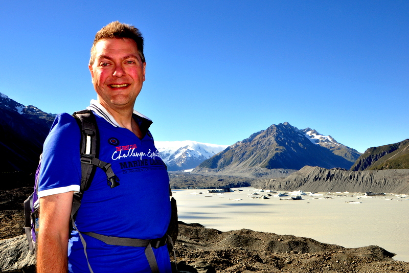 Remy bij het uitzicht op de Tasman Glacier Lake