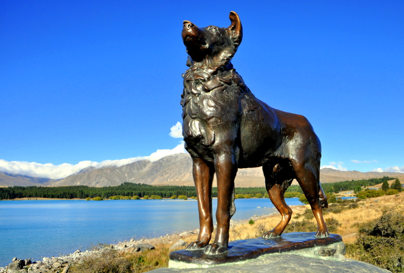 Langzaam draait de weg wat meer en na een paar bochten doemt een prachtig turquoise gletsjermeer op, Lake Tekapo. Gewoonweg geweldig, eenden en ganzen zwemmen en kwetteren op de voorgrond, en in de verte zien we de witte toppen van enkele 3000-ers in het zonlicht schitteren. We drinken een lekker bakje koffie/thee en genieten van het uitzicht. Een paar honder meter verder buigen we af naar de Church of the Good Shepherd, een klein steen/houten kerkje met een raam die een geweldig uitzicht biedt op het meer. Mocht iemand willen trouwen, dan weten we wel een goed plekje… Iets verder door prijkt een standbeeld van een Collie, als dank aan de schaapshonden die meegeholpen hebben het McKenzie gebied te ontginnen.