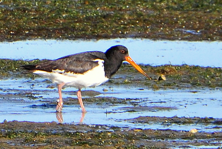 In de watergeulen om ons heen lopen Pied Oystercatchers verwoed hun maaltje bij elkaar te zoeken.