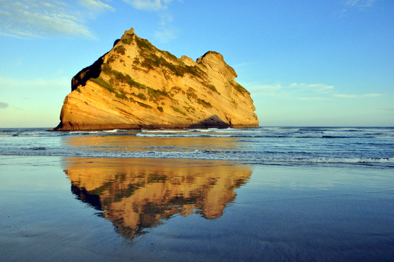 Maar niet getreurd het is prachtig weer en ik ga in ieder geval genieten van de zonsondergang op Wharariki Beach. Een prachtig strand met enorme rotspartijen, grotten en magnifiek uitzicht op de Archway Islands.