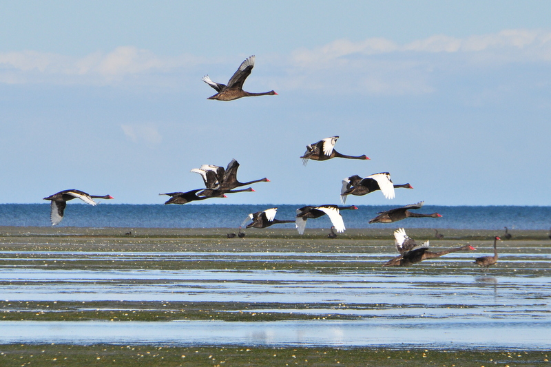Zwarte zwanen in de vlucht bij Farewell Spit.