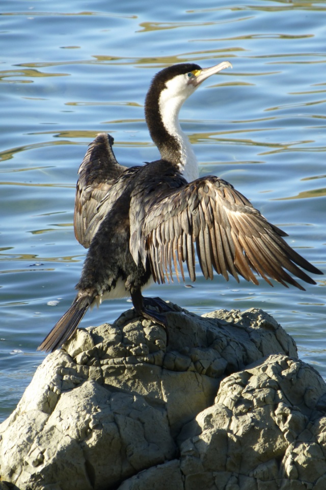 Onderweg zien we een aalscholver zijn best doen om zijn vleugels in de zon te drogen. Parmantig kijkt hij om zich heen terwijl hij zijn vleugels in de hoogte houdt. Even verder door zien we weer plevieren, reigers, ganzen en de verschillende oystercatchers. En natuurlijk ontbreken de luierende pelsrobben niet! En dat zijn we de wandeling niet eens begonnen. We lopen langs de kust over de hoge rotsformaties en kijken over de kleine baaien en de zee uit. In het water zien we pelsrobben en enkele bootjes die naarstig op zoek zijn naar dolfijnen die hier vaak aan de kust rondzwemmen. Het uitzicht is mooi en we genieten alweer van een heerlijk zonnetje…