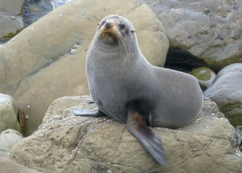 Vanaf Blenheim begint de zon weer door te komen en rijden we langs de oostkust naar Kaikoura, zo’n 50 km voor Kaikoura zien we hier en daar al een pelsrob op een rots of in het water. Zo’n 30 km voor Kaikoura stoppen we om een grotere groep pelsrobben te bewonderen.