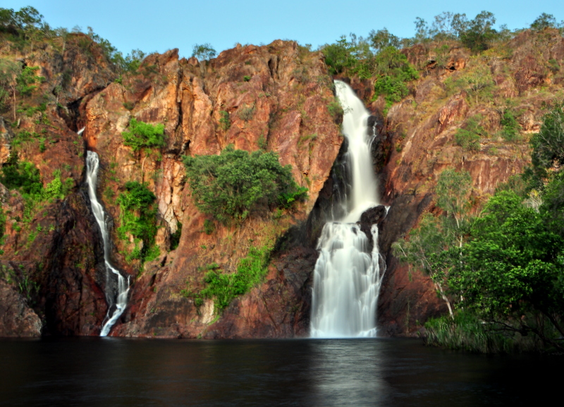 Dit is inderdaad een prachtige dubbele waterval en als extraatje kun je in de bomen in de buurt vliegende honden ofwel fruitbats zien hangen die zich klaarmaken voor hun eerste nachtelijke strooptocht op zoek naar voedsel. Dit is een plek waar je of heel vroeg of heel laat wil zijn omdat dit normaal vergeven is van de toeristen die hier, behalve voor de prachtige waterval ook komen om verkoeling te zoeken in het heerlijke koele meertje ervoor. Maar ook hier mag je nu niet zwemmen. Waarschijnlijk dus vanwege de mogelijke aanwezigheid van Salties.