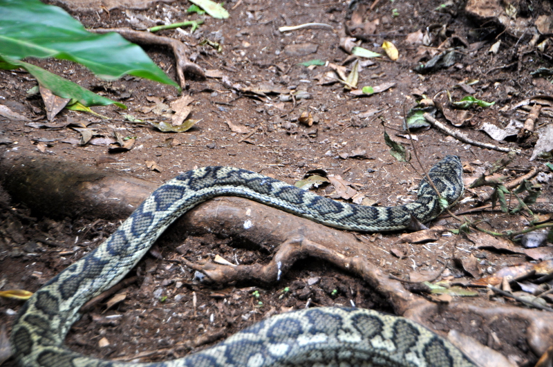 Na de lunch lopen we de Bellbird Lookout en gaan we driftig op zoek naar deze vogel… Het is een typisch geluid wat de vogel maakt, we horen hem de hele tijd, maar echt zien doen we hem niet. We turen de hele tijd omhoog en als we een ouder Australisch koppel tegenkomen, vragen die ons: “Did you see the Carpet snake back there?”. Wat!?! Waar?!? En ja hoor, op een boomstronk langs het pad lag dus gewoon een grote python (McDowell’s Carpet Python). Vanwege de schutkleur was het ook niet verwonderlijk dat we hem niet hebben zien liggen. En wij maar naar boven kijken op zoek naar vogels! Wat een prachtige slang. Gelukkig is hij (volgens de man) niet gevaarlijk en met een stok rolt de man hem nog een stukje uit. De python is zeker 3 meter lang en heeft een prachtig patroon op zijn huid! Goh, hebben we toch nog een drietal slangen gezien tijdens ons Australisch avontuur…