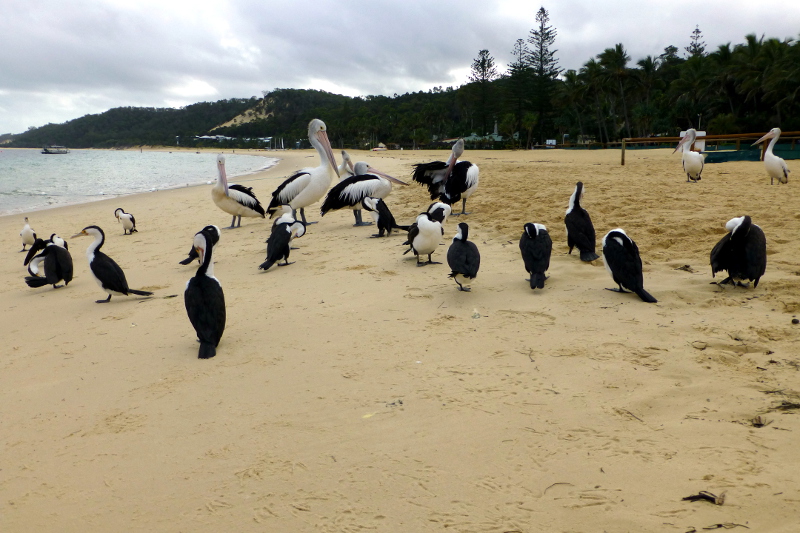 Bij de steiger wachten de aalscholvers en pelikanen ons al op. Ongestoord drogen ze hun veren in de ochtendzon die net doorbreekt. Er is weinig wind, heerlijk weer voor een dagje op het eiland! We lopen langs het strand naar enkele scheepswrakken. We kijken of we via de duinen een stukje het binnenland kunnen, maar de begroeiing is te dicht en we besluiten langs de duinen terug te lopen naar de steiger om te gaan lunchen. We zien en horen weer veel vogels en een Blue-winged Kookaburra laat zich gewillig fotograferen. Na de lunch gaan we op weg naar “The Desert”, een stuk stuifduinen midden tussen bossen. Een kleine hagedis rent voor onze voeten weg de bosjes in.