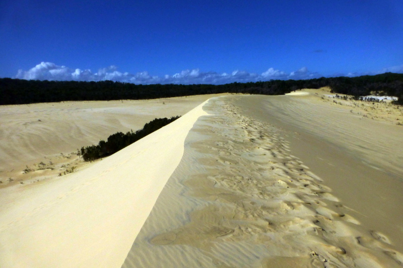Als we bij “The Desert” aankomen zien we eigenlijk een groot stuk zand met één hele grote en steile duin. Het schijnt een favoriete lokale bezigheid te zijn om met een stuk karton de steile duin omlaag te sleeën. Jacqueline vind een achtergelaten stuk karton en probeert dit ook te doen, maar het valt niet mee om ondanks de steile helling naar beneden te glijden.