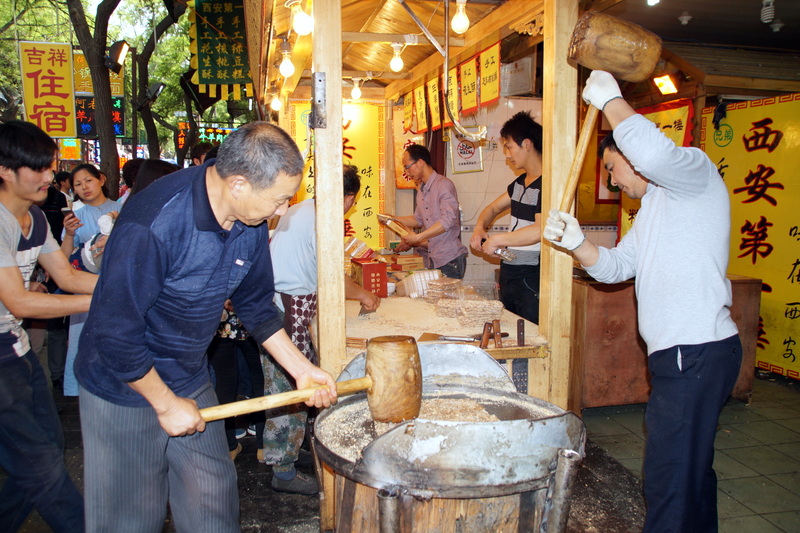 De diverse eetstalletjes zijn een lust voor het oog. Van varkenspootjes tot spiesjes met inktvis, kebab of ingewanden… Notenwinkeltjes met walnoten zo groot als je ze in Europa nog nooit gezien hebt. Die worden hier ook gekruid met zout en of peper in een soort deegtrommel. En dan die kraampjes waar mannen met grote houten hamers een soort pinda brei vermengd met kruiden of sesamzaadjes helemaal fijn slaan en opvouwen en weer slaan alsof ze bladerdeeg aan het bereiden zijn. Een typische delicatesse van hier waar wij geen weerstand aan kunnen bieden. Weet alleen niet of de doos Nederland bereikt… hihi.